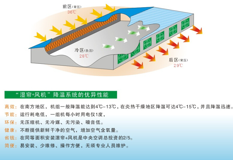 濕簾式降溫系統(tǒng)與負壓風機的綜合運用正是利用了水蒸發(fā)吸熱而使空氣冷卻的熱學(xué)原理,充分展示了水蒸發(fā)吸熱原理的三大要素:1.水與空氣接觸之表面積2.空氣的流通速度3.水本身的溫度并且水蒸發(fā)吸熱效率與以上要素均成正比1.在水泵與重力作用下,水從上往下流,在濕簾波紋狀的纖維表面形成總面積相當于水簾外觀面積10倍以上的褶皺型水膜,所以水膜與空氣的接觸面積是很大很大。