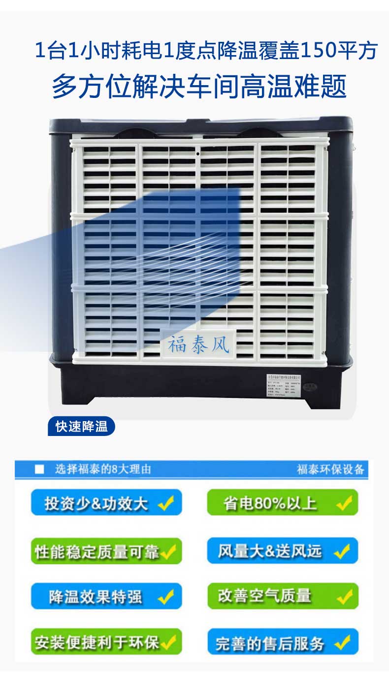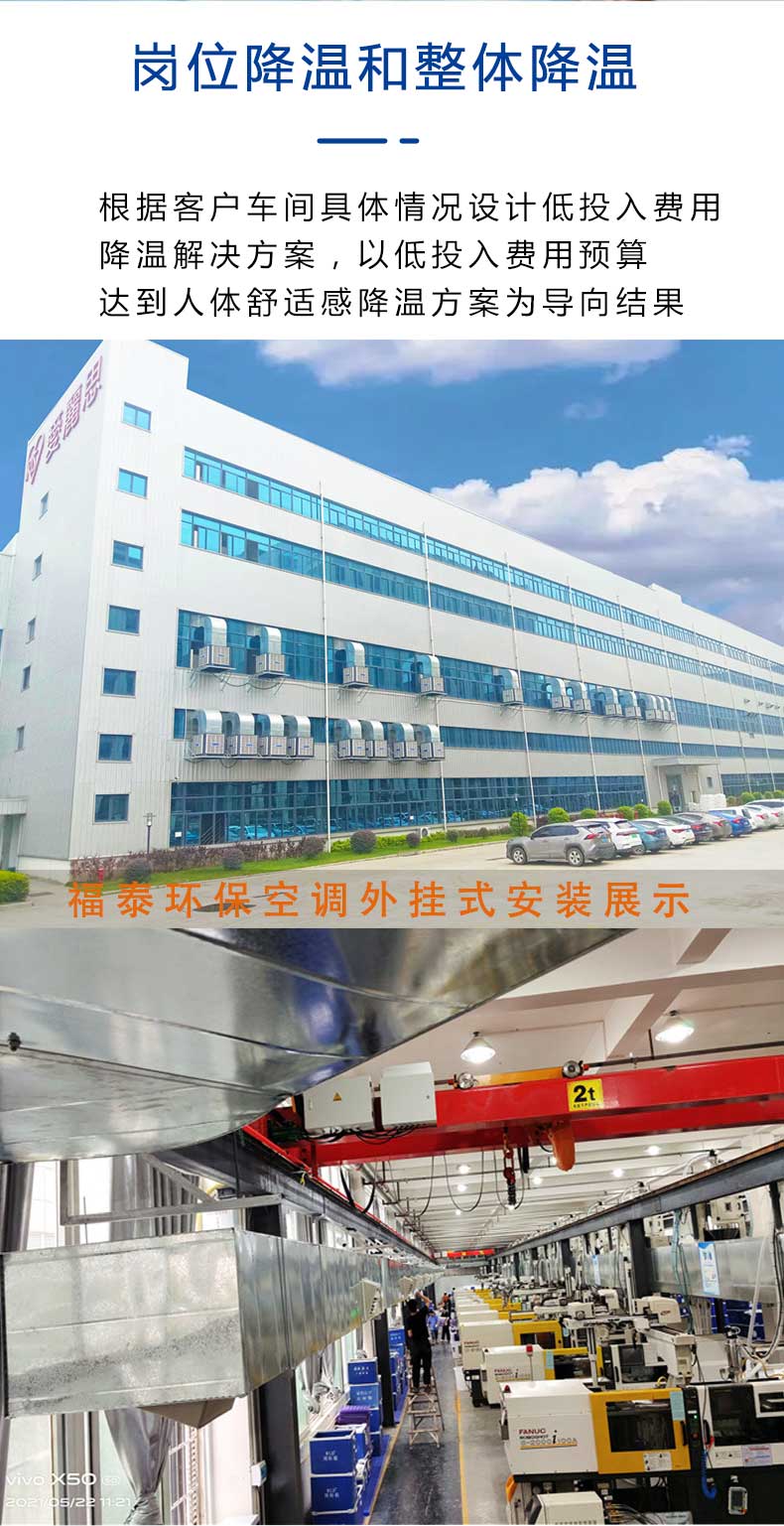 塑料廠注塑車間降溫問(wèn)題,對(duì)癥采用設(shè)計(jì)合理的降溫方案,將新風(fēng)送到注塑車間形成空氣對(duì)流,同時(shí)把車間異味,粉塵,高溫氣體排出。持續(xù)不斷新風(fēng)循環(huán)降溫方案,環(huán)??照{(diào)設(shè)備是解決注塑廠問(wèn)題快速有效的降溫設(shè)備,開(kāi)放式降溫和半敞開(kāi)的環(huán)境降溫用環(huán)??照{(diào)設(shè)備效果是非常好的,既可以選定崗位降溫方式,也可以根據(jù)需求整體降溫。很多客戶其實(shí)都想選擇一家有經(jīng)驗(yàn)有科學(xué)計(jì)算的策劃降溫方案給自己的工廠車間改善環(huán)境,那么福泰環(huán)??照{(diào)廠家具體是怎么來(lái)策劃不同行業(yè)的工廠車間高溫、悶熱、粉塵問(wèn)題呢,你們先了解它具體的降溫原理,環(huán)保空調(diào)在出口的干球溫度比室外干球溫度低5-12℃(干熱地區(qū)可達(dá)15℃),空氣愈干熱,其溫差愈大,降溫效果越好。由于空氣始終是從室外引進(jìn)室內(nèi),所以能保持室內(nèi)空氣的新鮮;同時(shí)由于該機(jī)利用蒸發(fā)降溫原理,因此具有降溫和增濕的雙重功能(相對(duì)溫度可達(dá)75%左右